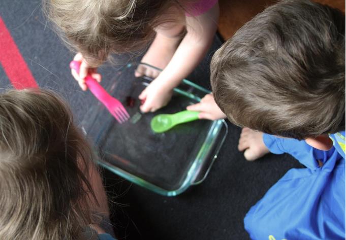 The kids can easily do the experiment and they went down to do it too. The kids wanted to stir these gummy bears to find out if the process got speeded up!